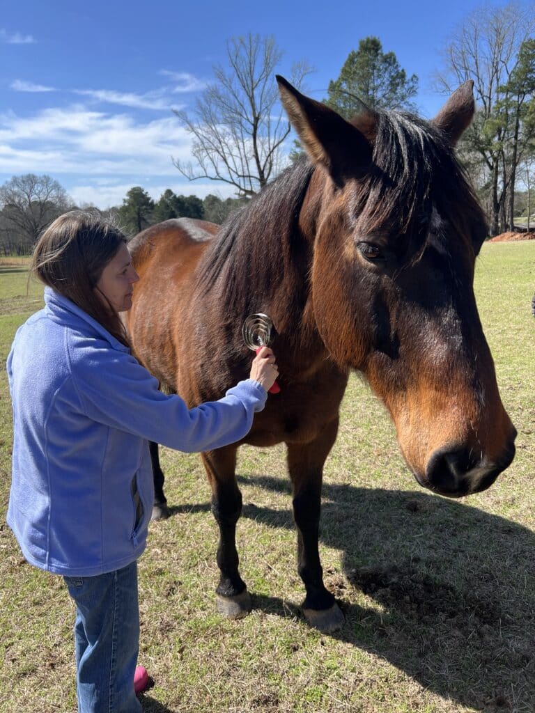 He has really helped Margaret with her cognition and getting those skills sharpen that she had. Forrest seems to have a sense that when she is around he is going to be loved on, and he’s so funny about it. He’ll hook his head around Margaret and hold her as if he’s hugging her. I’ve never seen a horse do this.