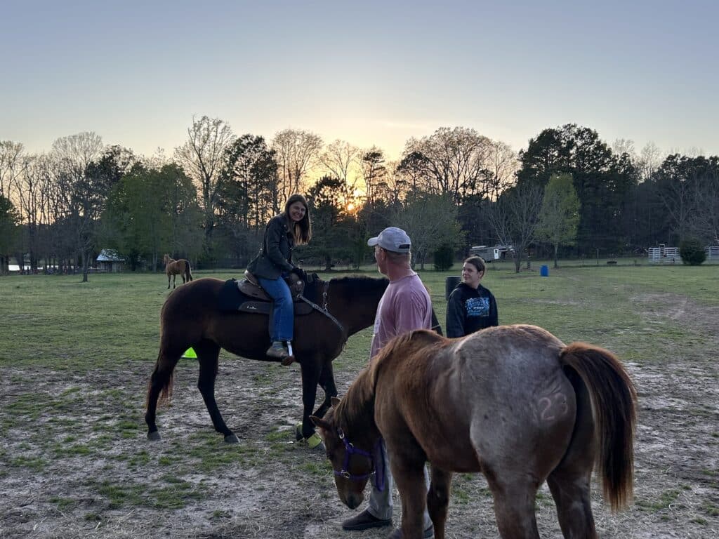We’ve since had her on an infusion of new medication that has seemed to have stopped the progression. Our neighbor, Tim Preator and his daughter Linley would ride their horses on our property and we’d watch them and talk about how fun it would be to have a couple of horses. When the ADC Horse Auction came up, Tim suggested we go. When we saw Forrest we both smiled and I could see her (my wife) light up.