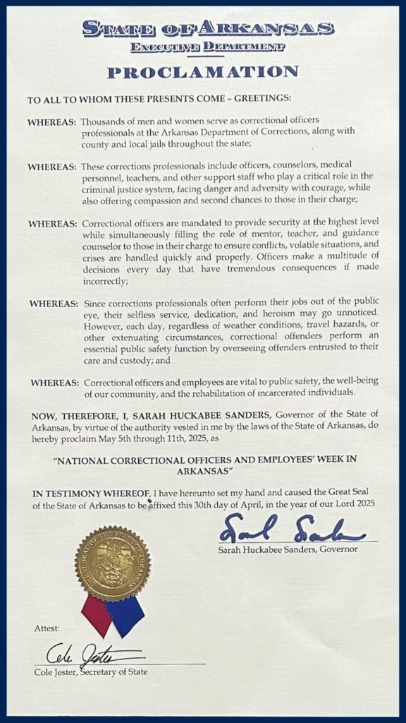 On April 30, 2025, Governor Sarah Huckabee Sanders proclaimed May 5th through 11th, 2025 as National Correctional Officers and Employees’ Week. Governor Sanders stated, “These corrections professionals include officers, counselors, medical personnel, teachers, and other support staff who play a critical role in the criminal justice system…”